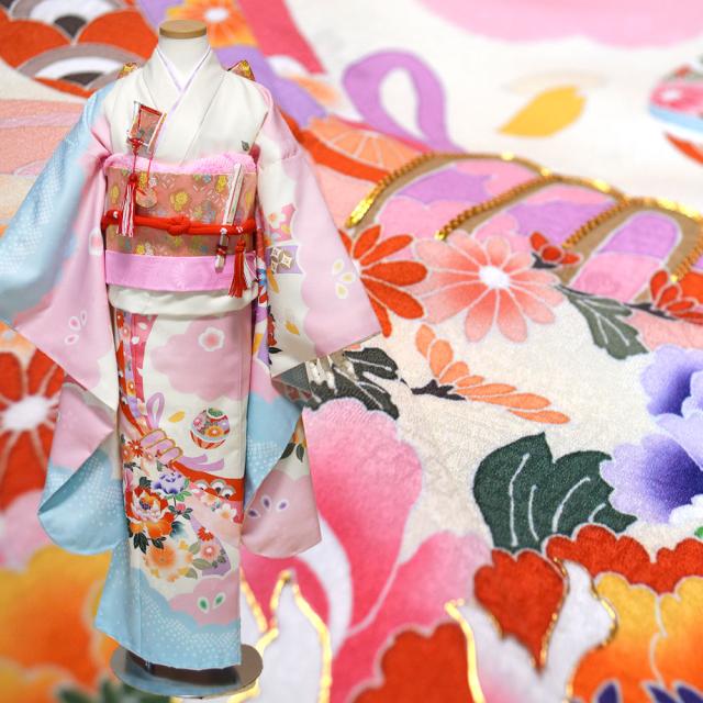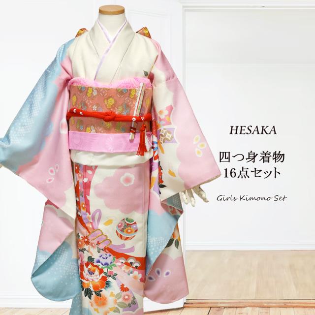 着物(四つ身)・重ね衿・長襦袢・御祝帯・草履・バッグ・丸ぐけ・はこせこ・扇子・びらかんざし・帯揚げ・しごき・足袋(19-20cm、ストレッチタイプのソックス型)・腰紐3本