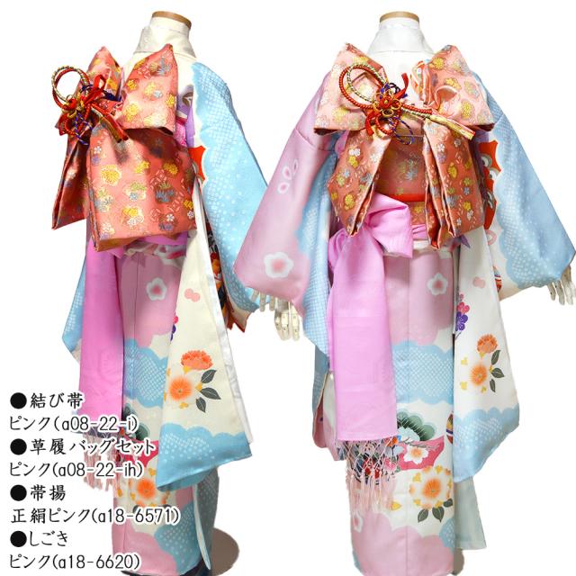 着物(四つ身)・重ね衿・長襦袢・御祝帯・草履・バッグ・丸ぐけ・はこせこ・扇子・びらかんざし・帯揚げ・しごき・足袋(19-20cm、ストレッチタイプのソックス型)・腰紐3本