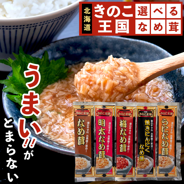 なめ茸、明太なめ茸、梅なめ茸、うになめ茸、焼きにんにくなめ茸の人気の5種類をセットにしたお試しメール便セットです。