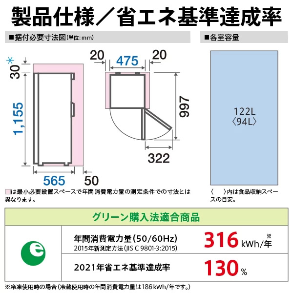 1台3役(冷蔵/チルド/冷凍)「3温切替機能搭載」※1 上向き角度で見やすい、操作しやすい「ドア上タッチパネル」 電子レンジ・オーブントースターが置ける耐熱100℃トップテーブル ■定格内容積 122L<94L> ■外形寸法 幅475mm×高さ1155mm×奥行565mm ■据付必要奥行寸法 615mm ■年間消費電力量(50Hz/60Hz) 316/316kWh/年※3 ■定格消費電力 電動機(50Hz/60Hz) 65/65W ■定格消費電力 電熱装置(50Hz/60Hz) 140/140W ■製品質量 30kg 定格内容積<>内は食品収納スペースの目安 ※1:温度切替は庫内全体での切り替えになります。バスケットごとに設定はできません。 ※2:クイック冷凍設定時には、通常冷凍モードでの運転と比べて、約40%消費電力量が増加します。なお消費電力量は使用条件によって変化します。 ※3:冷凍使用時の場合。 ※記載は商品仕様の一部です。仕様説明不足等の理由での返品はできません。特に適合等は必ずご確認ください。