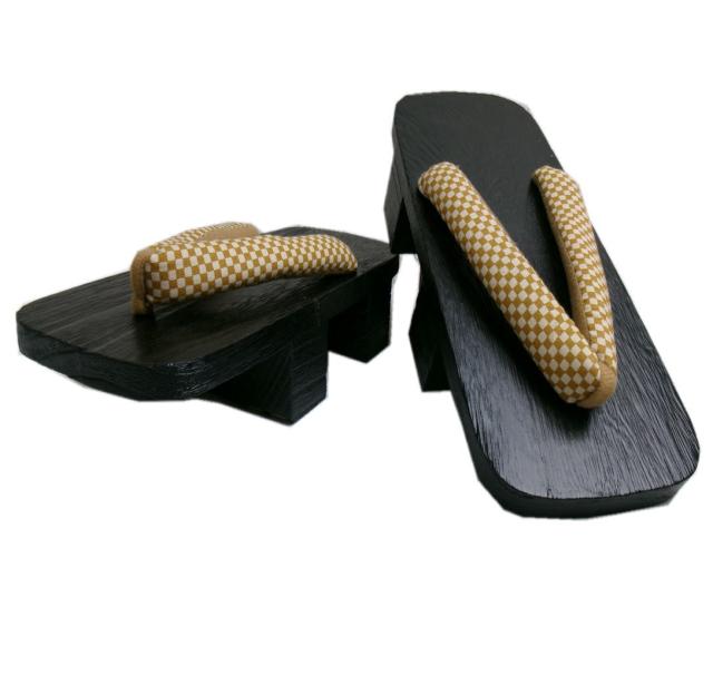 下駄 二枚歯 メンズ 男性 漆黒台 金茶きなり市松 フリー 25.5cm 浴衣 甚平 着物 男物 紳士用 げた ゲタ 25cm 26cm 2枚歯 ゆかた きもの 黒色 市松柄
