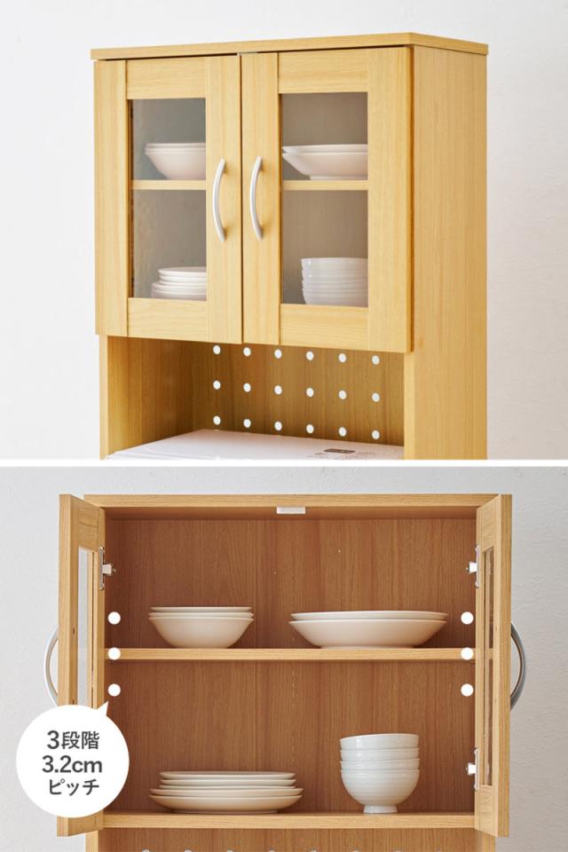 上段の扉収納は、中身が見えるガラス扉を採用。どこに何を入れているか一目でわかり、取り出しやすく家事の時短にも。同時にお気に入りの食器のディスプレイも楽しめます。棚板は、収納したい物に合わせて高さを調節できる可動式です。