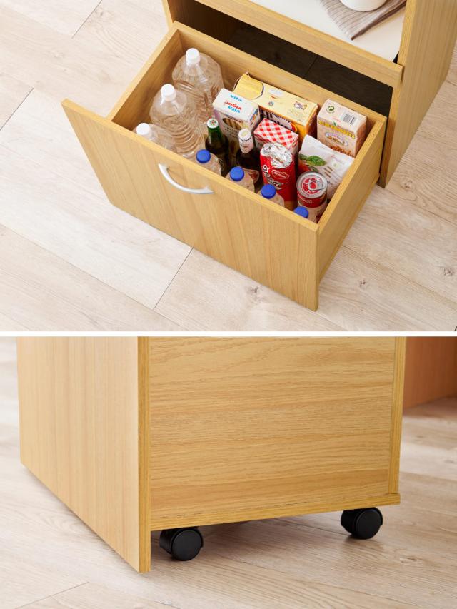 下部は、本体から離して動かせるワゴン。2リットルのペットボトルを立てて収納しておける深さなので、背の高い調味料や食品のストック入れとしておすすめです。前面からは見えない隠しキャスター仕様で、すっきりとした見た目もポイント。