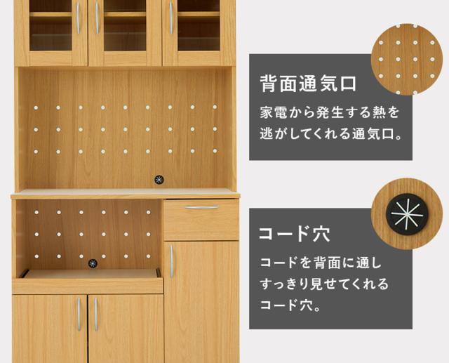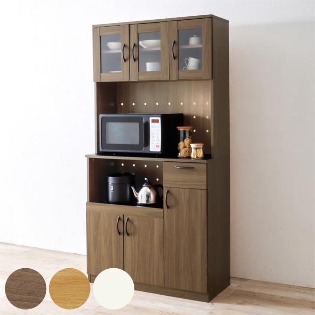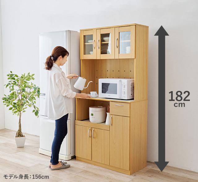家電も食器もまとめて収納できる大容量タイプのキッチンボードです。引出しやスライド収納、大きさの違う扉収納などの機能がたくさん。幅89cm高さ182cmのたっぷりサイズで、収納力が抜群です。