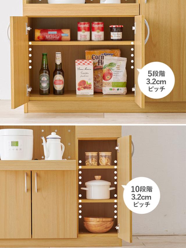 下部の2ヶ所の扉収納は、中が見えないので食品のストック置きとして最適です。最下段はしっかりとした底板で、重たい瓶なども安心して置けます。こちらも可動棚なので、棚板の高さを調節できます。