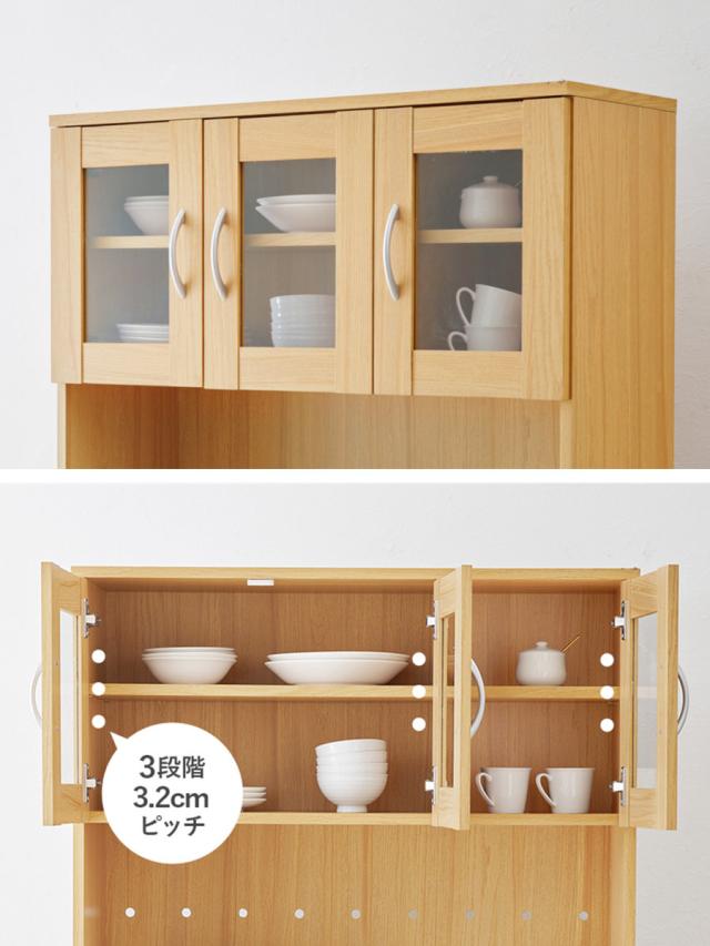 上段の扉収納は、中身が見えるガラス扉を採用。どこに何を入れているか一目でわかり、取り出しやすく家事の時短にも。同時にお気に入りの食器のディスプレイも楽しめます。棚板は、収納したい物に合わせて高さを調節できる可動式です。