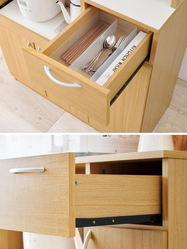 カトラリーや布巾などの小物を整理できる引出し収納。スライドレール仕様なので、開閉がスムーズです。