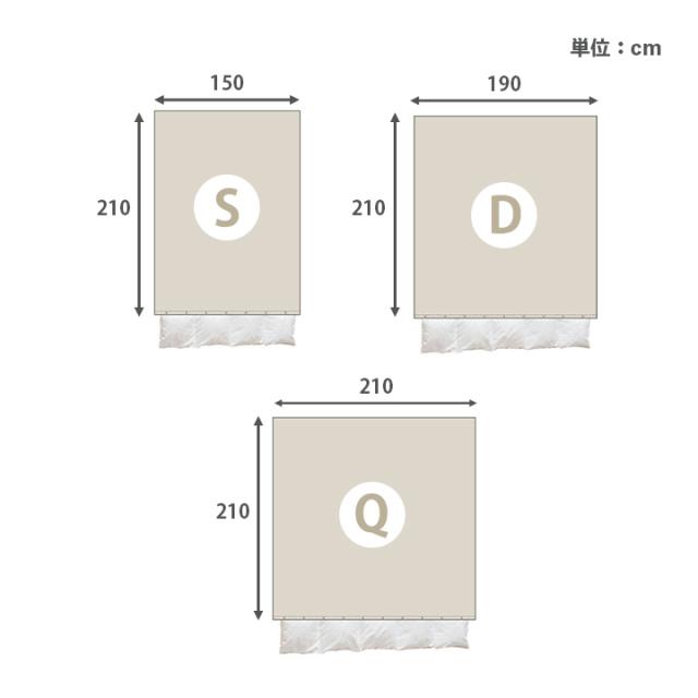 | シングル:150×210cm ダブル:190×210cm クイーン:210×210cm |
