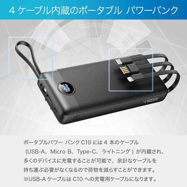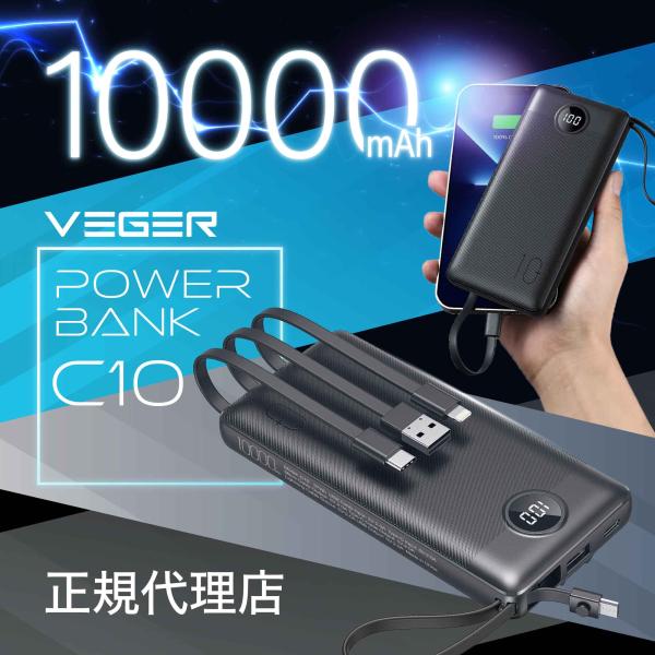 日本正規販売代理店 VEGER Power Bank C10 10000mAh モバイルバッテリー 4ケーブル内蔵モデル