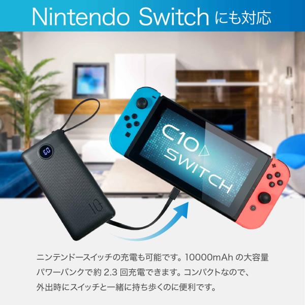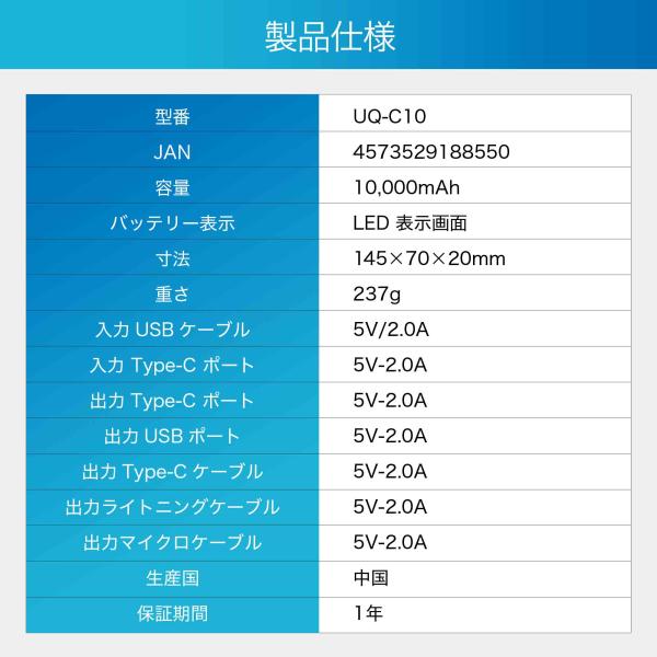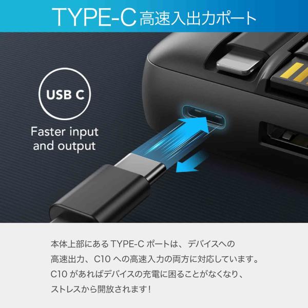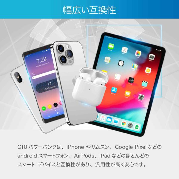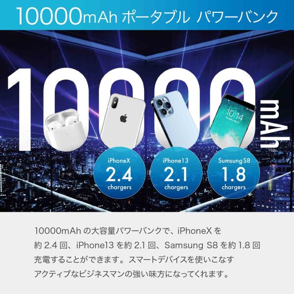 10000mAhの大容量パワーバンクで、 iPhoneXを約2.4回、iPhone13を約2.1回、Samsung S8を約1.8回充電することができます。