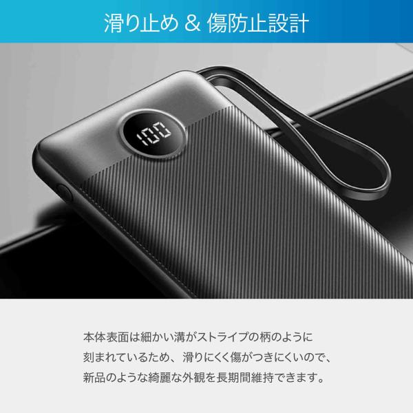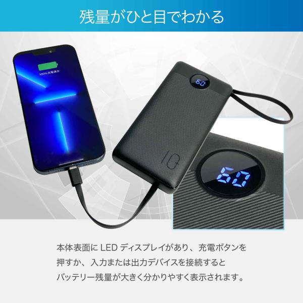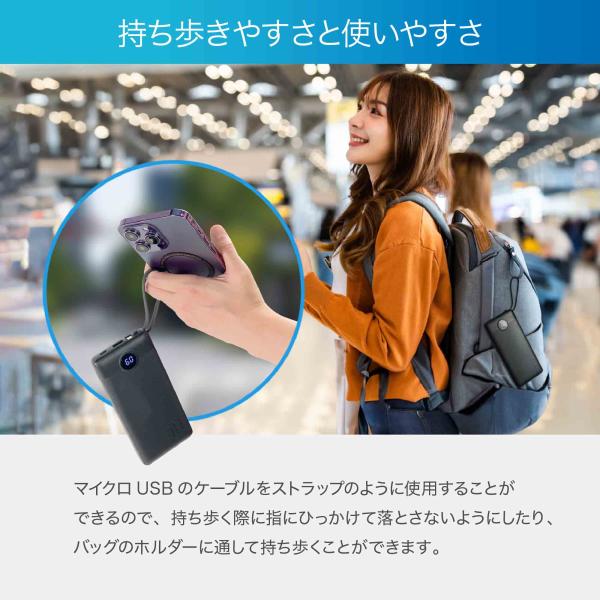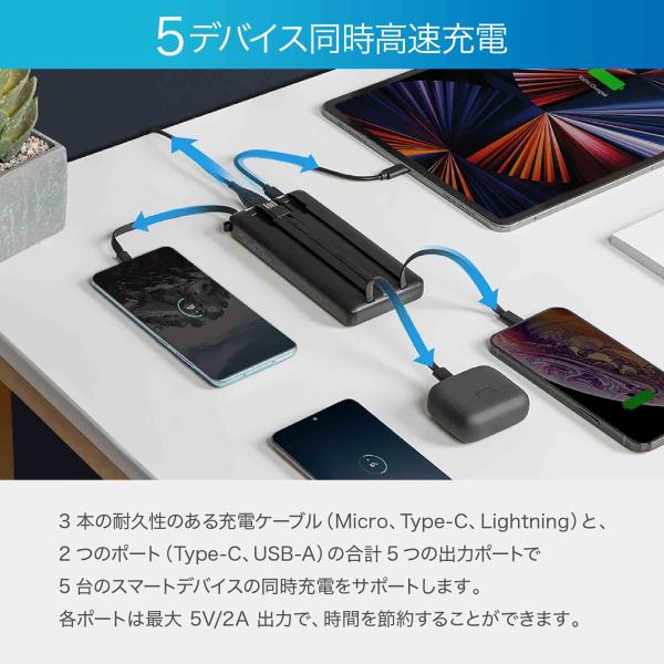 4 本のケーブル(USB-A、Micro B、Type-C、ライトニング) が内蔵され、多くのデバイスに充電することが可能で、余計なケーブルを持ち運ぶ必要がなくなるので荷物を減らすことができます。