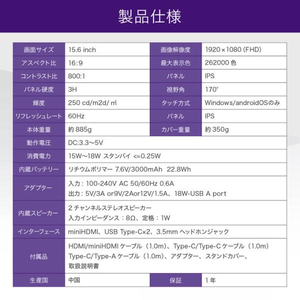 『Mini HDMI to HDMIケーブル』『Type-C to Cケーブル』『Type-C to Aケーブル』が各1本ずつ付属していますのでご購入後すぐにお使いいただけます。