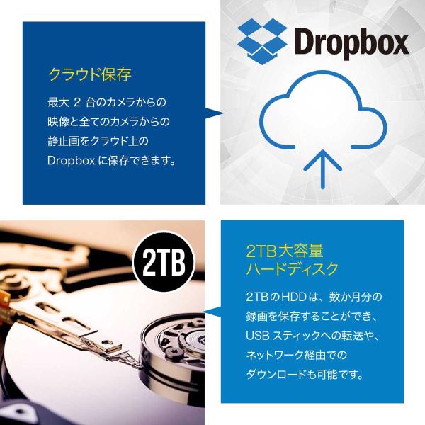 2TBの大容量HDDは、古いファイルを上書きすることなく、数ヶ月分のビデオを保存することができます。