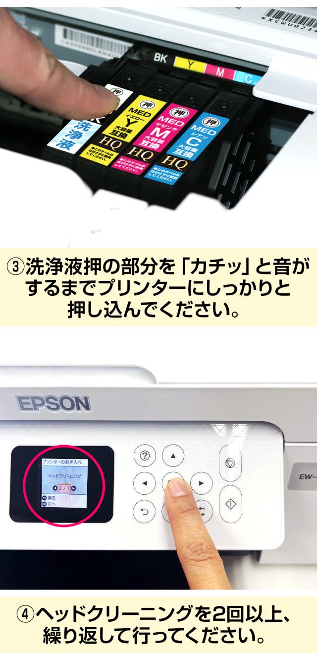 1.ノズルチェックで印刷不良の色を確認し、その色のインクカートリッジをプリンター本体から取り外します。 2.お手元にある洗浄液カートリッジのカラーテープ(空気穴テープ)を取り外し、 押の部分を「カチッ」と音がするまでプリンターにしっかりと押し込んでください。 3.プリンター操作パネルのメニューから、「プリンターヘッドのクリーニング」を選択し 2回程繰り返します。 4.プリンターの電源をいれたまま、2時間ほど放置してください。 5.洗浄カートリッジを取り外し、インクカートリッジを装着して「プリンターヘッドのクリーニング」を繰り返します。 6.ノズルチェックをして、目詰まりが解消されているか確認してください。 ※※もし解消されない場合は、1日おいて再度洗浄することをおススメいたします。 |