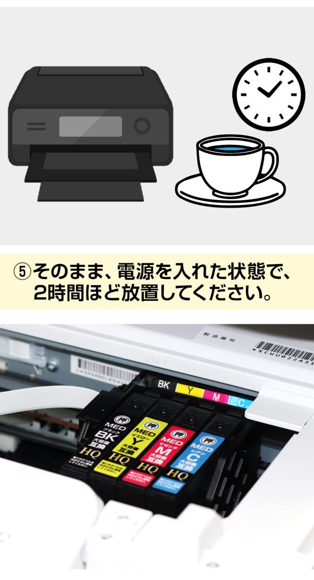 1.カートリッジの抜き差しをする。 2.全部のインクを取り出す。 3.電源をオフにしてコンセントも抜く。 4.20分程時間をおいて、電源を入れ、ブラックから差していく。 |