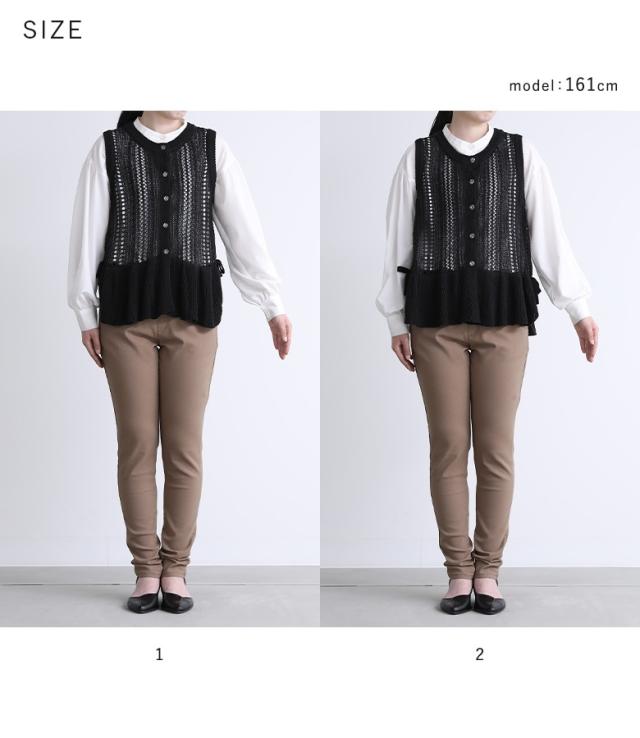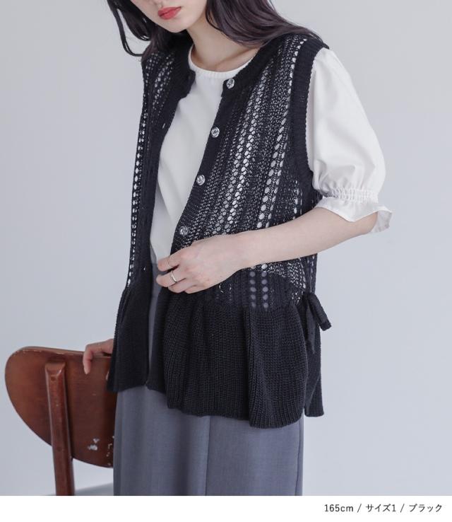 『透かし編みフリルニットベスト』【メール便不可】【30】[ベスト レディース トップス ニット ジレ ニットベスト 透かし編み フリル リボン バラモチーフ ボタン 夏]