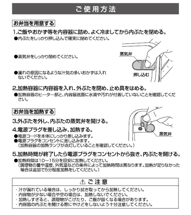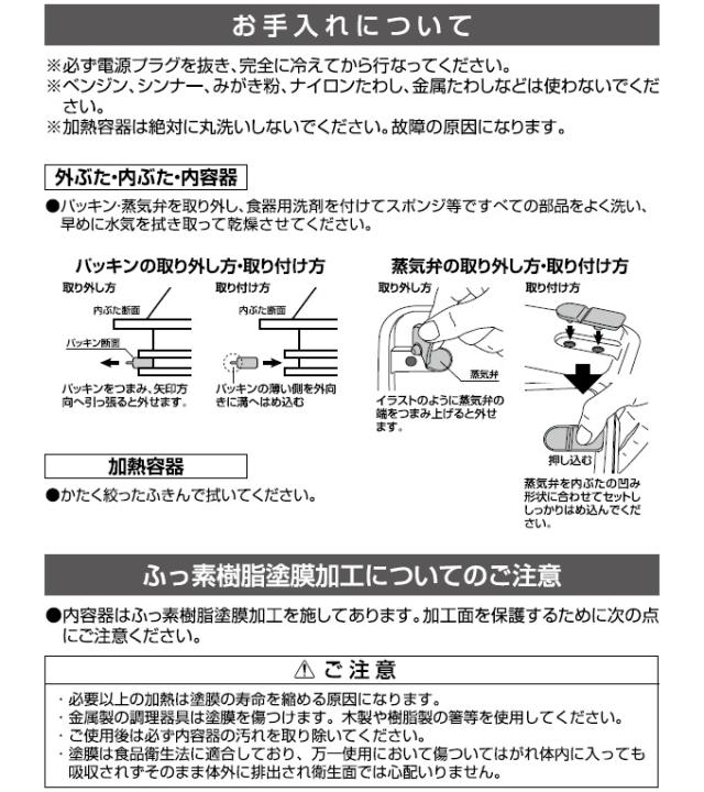 ・加熱容器の丸洗いはしないでください。 ・加熱中・加熱後しばらくは、ヒーター部や内容器など高温部に触れないでください。 ・定格15A以上・交流100Vのコンセントを単独で使ってください。 ・内容器が空の状態で加熱しないでください。また必要以上に長時間加熱しないでください。 ・電子レンジ・食器洗い乾燥機には使用しないでください。 |