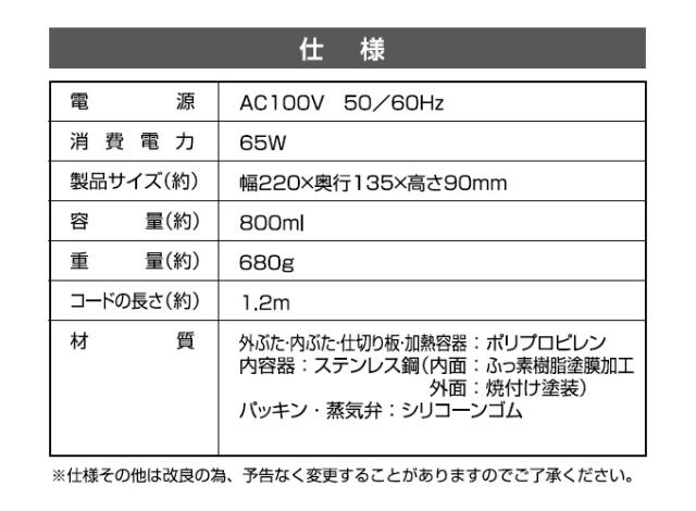 外ぶた・内ぶた・仕切り板・加熱容器:ポリプロピレン 内容器:ステンレス鋼(内面:ふっ素樹脂塗膜加工 外面:焼付塗装) パッキン・蒸気弁:シリコーンゴム |