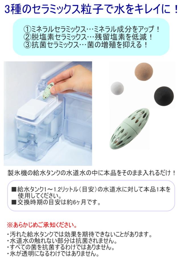 | 特徴 | 冷蔵庫の自動製氷機の給水タンクに入れるだけ!製氷機を清潔に保ちます。 3種のセラミックス粒子で水をキレイに! ●ミネラルセラミックス:ミネラル成分をアップ! ●脱塩素セラミックス:残留塩素を低減! ●抗菌セラミックス:菌の増殖を抑える! 給水タンク1〜1.2リットル(目安)の水道水に対して本品1本を使用してください。 ※交換時期の目安は約6ヶ月です。 【あらかじめご了承ください】 ・汚れた給水タンクでは効果を期待できないことがあります。 ・水道水の触れない部分は抗菌されません。 ・全ての菌を抗菌するわけではありません。 ・氷が透明になるわけではありません。 ■ネコポス(メール便:全国一律300円)での配送もお受けします。 【ネコポス便の条件とご案内】 『メール便(ヤマト運輸)』を指定してお買い上げの方に限りますので、配送方法を選択していない場合は宅配便(通常送料)となりますのでご注意ください。 商品ページでは配送方法の選択はできませんので、必ずご注文手続き画面で配送方法を選択してください。 ネコポス対応品以外もお買い上げの場合、ネコポスを選択することができなくなるため、通常の宅配便での手配となります。 大きさの都合上本商品は「9個」までネコポス対応となりますので、10個以上お買上げの場合はネコポスの複数個口か通常の宅配便で手配します。 ネコポスの送料はシステムの都合上「数量×送料(300円)」で自動計算されますが、ショップ側でいくつ入るか計算して送料を修正いたします。 『ネコポスについての補足』という画像に詳細を載せておりますので、ご注文前に必ずご確認ください。 送料無料条件をクリアした場合、まとめて宅配便で出荷させていただくことがございます。(どうしてもネコポスがいいという場合はお受けすることもできますが、ネコポス複数個口分の送料をいただきます。) ※住所を元に配達するため、住所不備による配達誤りなどについてはご対応できません。 ※ネコポスは転送ができませんので、ご注文を確定する前に必ずお届け先住所に間違いがないかご確認くださいますようお願いいたします。 ※手渡しではなく投函となるため、郵便受けがない場所へはお届けできません。 ※ネコポスは日時指定ができませんので予めご了承くださいませ。 ※ネコポスの詳細はヤマト運輸ホームページをご覧ください。 |