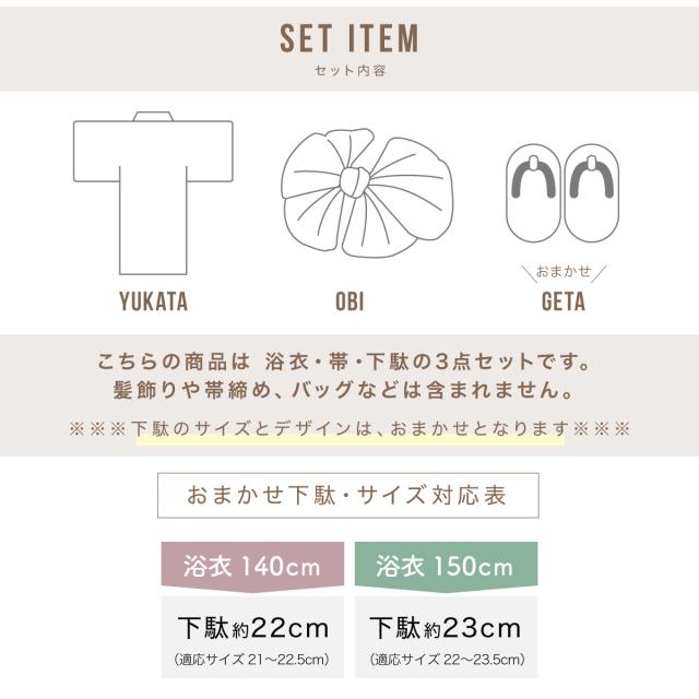 ※【浴衣・帯・下駄】の3点セットです。セット内容の一部変更や、それに伴う値引きは承っておりません。