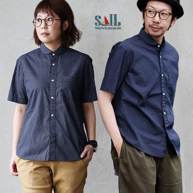 シャツ レディース メンズ 半袖 丸襟 ピンドット ドット 日本製 コットン 綿100% おしゃれ 配色 刺繍 刻印ボタン 夏 プルオーバー 風 アイロン不要 すっきり ボックスシルエット 着痩せ 半袖シャツ 仕事 オフィス カジュアル パティ SAIL セイル