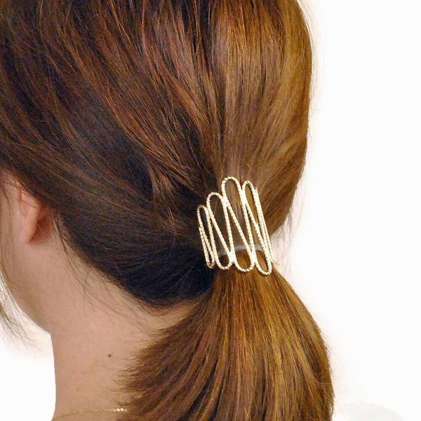 | 表面の凹凸加工が光を受けて上品にキラキラと輝く♪ 波打つメタルラインがヘアスタイルを華やかにランクアップしてくれる透かしヘアフック★ ヘアゴムの結び目に差し込むだけで簡単装着◎ ロングのウェーブヘアやヘアアレンジなど、華やかなイメージのヘアスタイルと相性GOODです! |