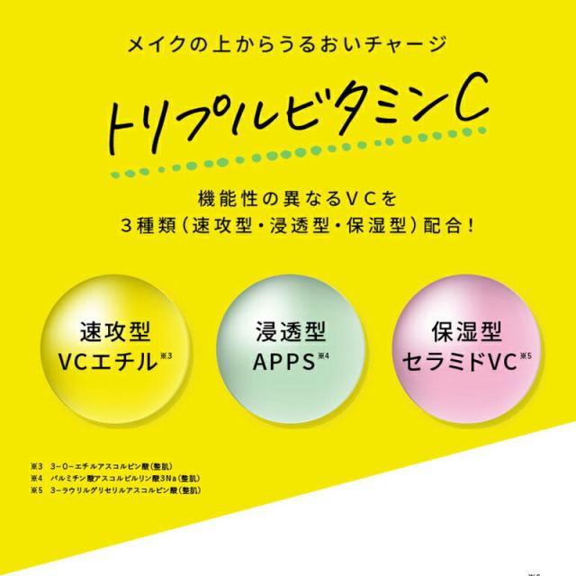 *1 パルミチン酸アスコルビルリン酸3Na(整肌)、3-0-エチルアスコルビン酸(整肌)、3-ラウリルグリセリルアスコルビン酸(整肌) *2 整肌・保湿・水・紫外線吸収剤を含む *3 日やけによるしみ、そばかすを防ぐ