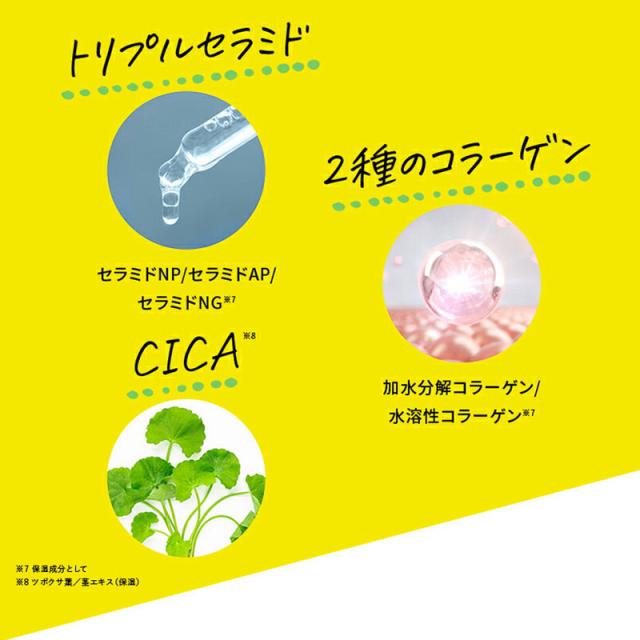 | 成分 | 水、PEG-50水添ヒマシ油、オクトクリレン、ペンチレングリコール、サリチル酸エチルヘキシル、BG、t-ブチルメトキシジベンゾイルメタン、エトキシジグリコール、エチルヘキシルトリアゾン、パルミチン酸アスコルビルリン酸3Na、3-0-エチルアスコルビン酸、3-ラウリルグリセリルアスコルビン酸、ヒアルロン酸ヒドロキシプロピルトリモニウム、セラミドNP、セラミドAP、セラミドNG、リンゴ果実培養細胞エキス、アルブチン、グリチルリチン酸2K、バクチオール、ビサボロール、ツボクサ葉/茎エキス、ヘキサカルボキシメチルジペプチド-12、加水分解コラーゲン、水溶性コラーゲン、ビスエチルヘキシルオキシフェノールメトキシフェニルトリアジン、クエン酸Na、クエン酸、ベヘニルアルコール、ペンタステアリン酸ポリグリセリル-10、ステアロイルラクチレートNa、キサンタンガム、フィトスフィンゴシン、グリセリン、レシチン、フェノキシエタノール |