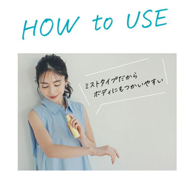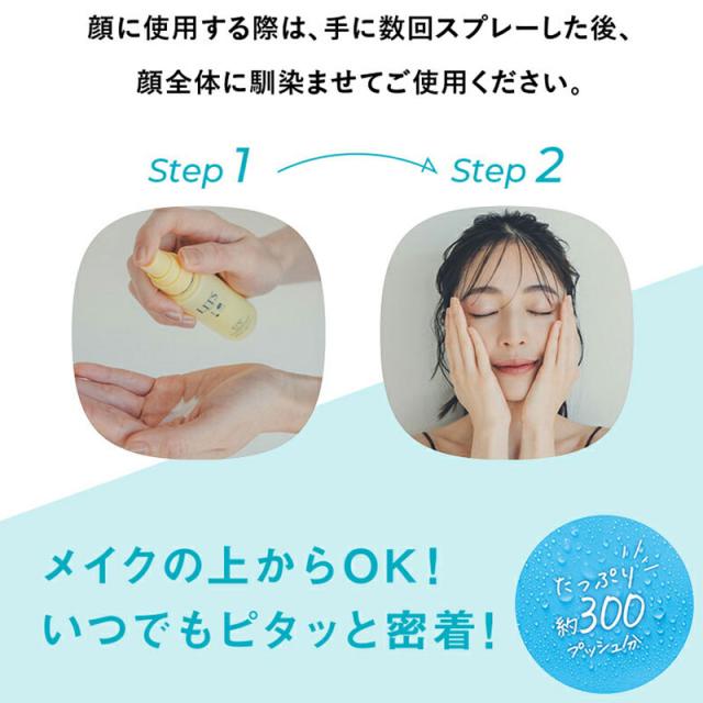 | ご使用方法 | 肌から20cmほど離してスプレーし、ムラなくなじませます。 顔に使用する場合は一度手のひろに出し、目や口を閉じて少量ずつなじませてください。 お休み前には、石けん等で丁寧に洗い流してください。 |