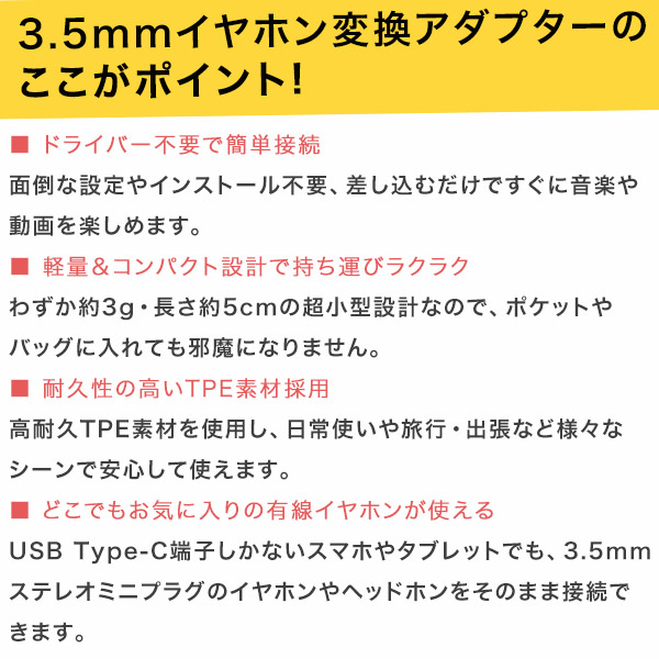 USB Type-C端子しかないスマホやタブレットでも、 3.5mmステレオミニプラグのイヤホンやヘッドホンをそのまま接続できます。