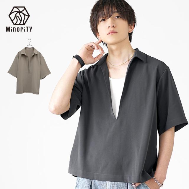 ポロシャツ メンズ 半袖 スキッパー ポロシャツ 長袖 Vネック チェック シアー素材 プルオーバー シャツ メンズ オーバーサイズ キーネック ビッグシルエット チャコール グレー ブラウン モード系 春 春服 韓国 ファッション メンズファッション マイノリティ minority
