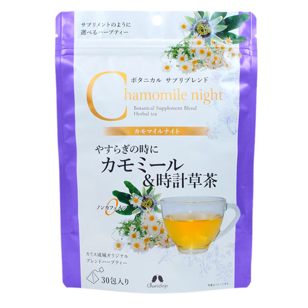 「カリス サプリブレンド カモマイルナイト 7包入 (品番:2805)」は、やすらぎの時におすすめのカモマイル、パッションフワラーに、レモンバーベナをブレンドしました。心地よい香りのハーブティーです。一日の終わりのリラックスタイム・緊張をほぐしたいとき・穏やかに過ごしたいときなどにオススメです。