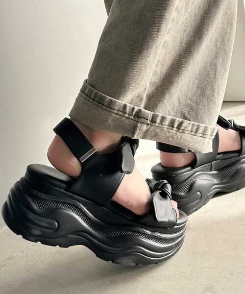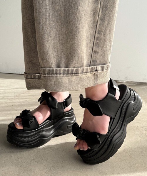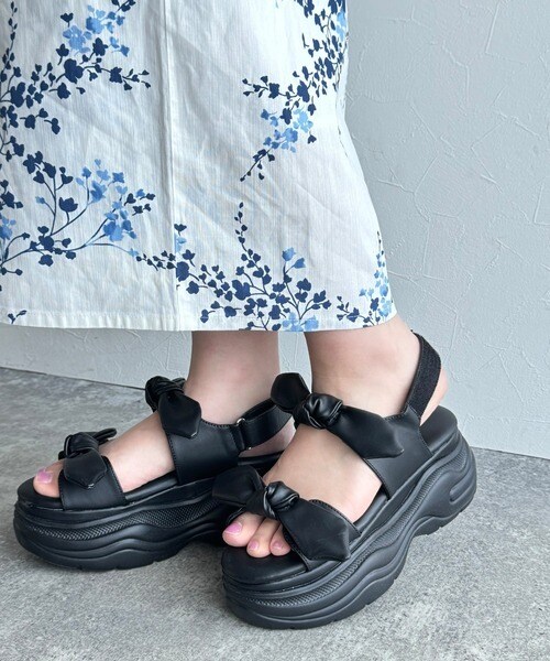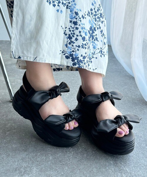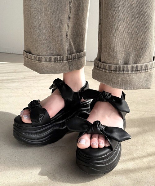 リボンデザインが目を惹くこちらの厚底サンダルは