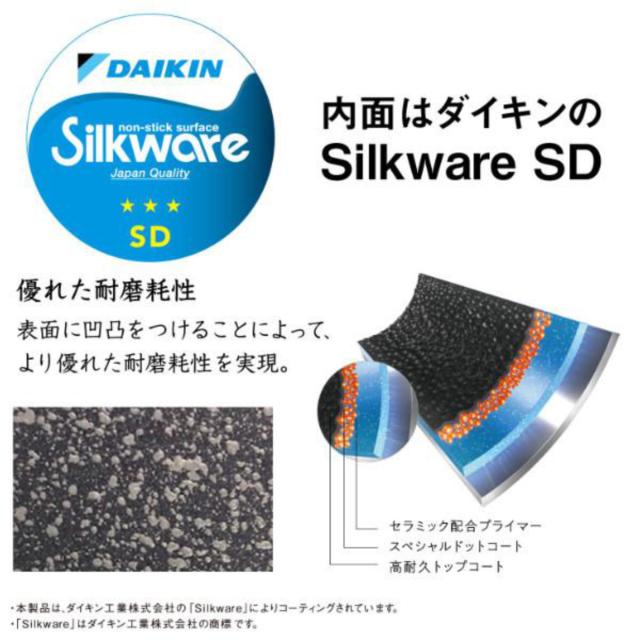 ●内面には、ダイキンの「Silkware SD」を採用。表面に凹凸を付けることによって、耐磨耗性に優れ、こびりつきにくいです。