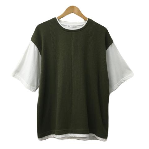【中古】イッカ Tシャツ カットソー ラウンドネック プルオーバー ワッフル レイヤード風 五分袖 XL 緑 白