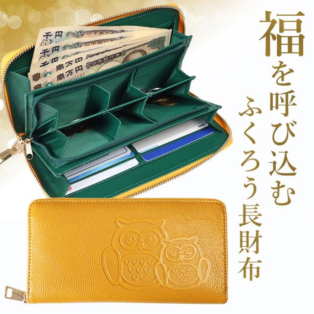 【福を呼ぶふくろう財布、健康×金運】牛革ふくろうポケットいっぱい長財布 長財布 レディース 大容量 ふくろう ラウンドファスナー式 使いやすい 小銭入れ カード入れ 金運 牛革 黄色 イエロー