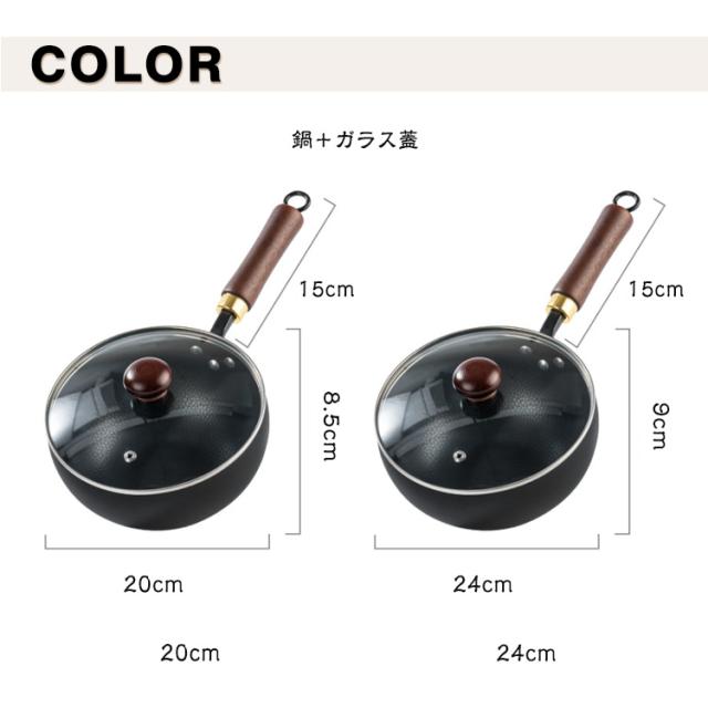 | サイズについての説明 | サイズ:【20cm】口径20cm 深さ約8.5cm ハンドルの長さ約15cm 【24cm】口径24cm 深さ約9cm ハンドルの長さ約15cm ※サイズ計測には誤差が生じます。 |