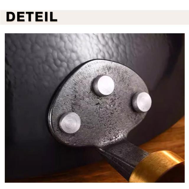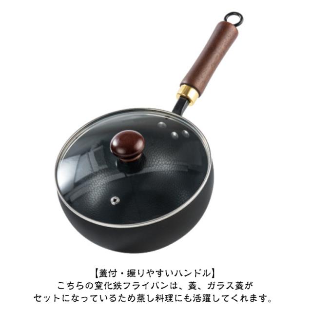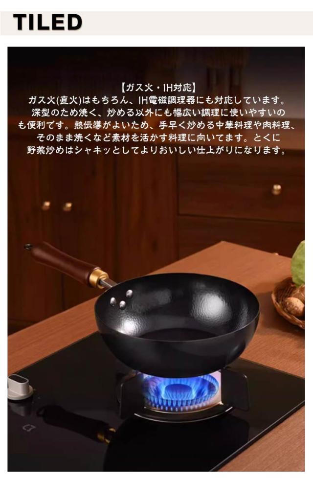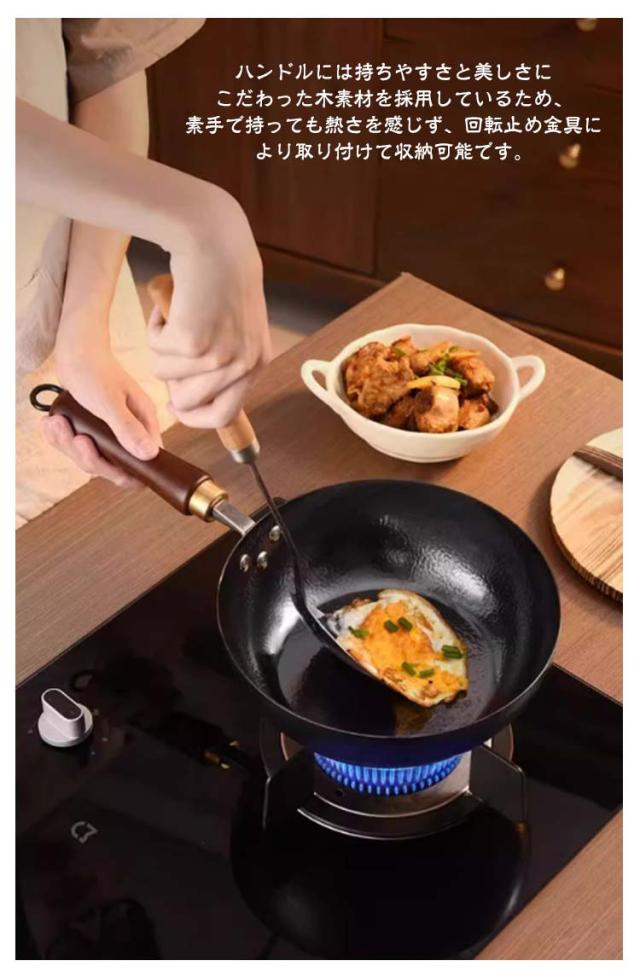 | 省エネ ガス代節約!ガス/IH対応!鉄製中華鍋 【ガス火・IH対応】ガス火(直火)はもちろん、IH電磁調理器にも対応しています。深型のため焼く、炒める以外にも幅広い調理に使いやすいのも便利です。熱伝導がよいため、手早く炒める中華料理や肉料理、そのまま焼くなど素材を活かす料理に向いてます。とくに野菜炒めはシャキッとしてよりおいしい仕上がりになります。 【蓋付・握りやすいハンドル】こちらの窒化鉄フライパンは、蓋、ガラス蓋がセットになっているため蒸し料理にも活躍してくれます。ハンドルには持ちやすさと美しさにこだわった木素材を採用しているため、素手で持っても熱さを感じず、回転止め金具により取り付けて収納可能です。そして、フライパン部とハンドル部の角度にもこだわり料理初心者にもおすすめです。使用後は洗剤を使わずサッとスポンジで洗うのみで良いため、お手入れも楽々です。 【各家庭で色々なお料理に挑戦】炒め物はもちろん、ぎょうざ、ホットケーキ、目玉焼き、煮物、ステーキ、揚げ物、蒸す、焼く、茹でるなど幅広い調理方法に対応できる、使い勝手のいい深型中華フライパンです。窒化鉄フライパンでは購入後の空焚きが必要ありません。購入したら一度よく洗って、あとは油ならしして使うだけでOK。普段使い終わったあとは、洗剤などは使わず洗うのも魅力! | |
