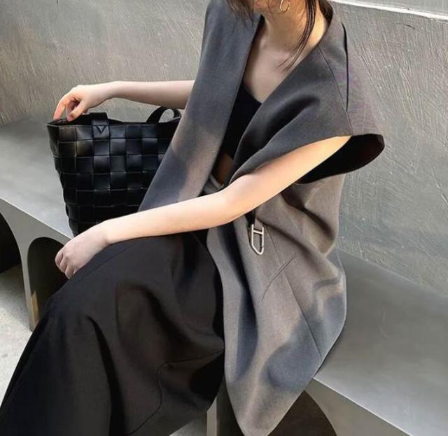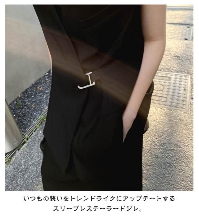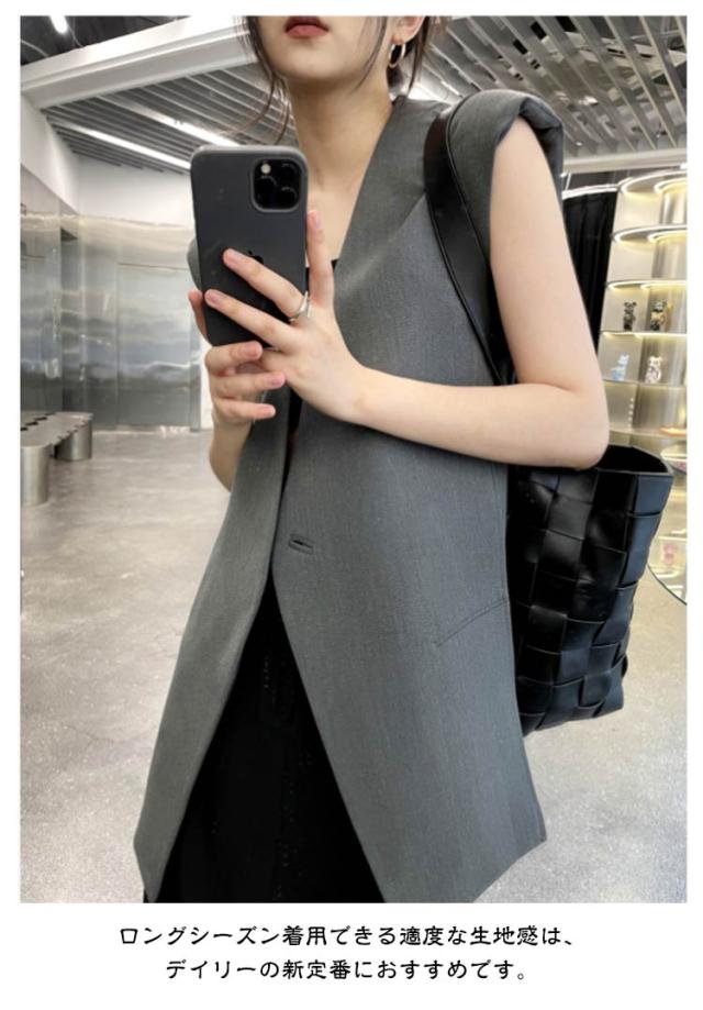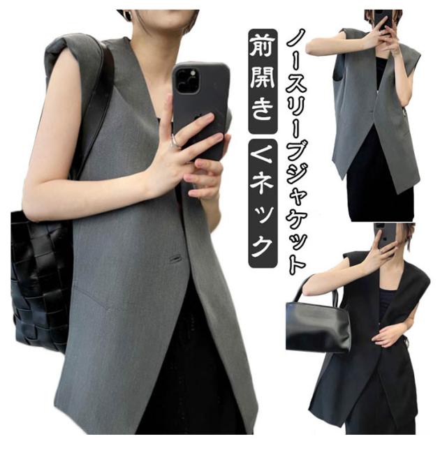 前開き ロングベスト ジレ ノースリーブ ノーカラーベスト ロングジレ ベスト 春夏 カジュアル ジレジャケット ノースリーブジャケット ジレ チュニック丈 おしゃれ エレガント フォーマル Vネック 通勤 ブラック