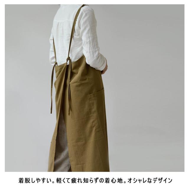 | シンプルで実用的な綿素材のクロスエプロン。 スポッとかぶるだけで着られて、着丈長めなのでワンピースみたいに使えます。 薄すぎず厚すぎず通気性よく素材で、通年使えそうです。 ポケットが横についているので、屈んだときに入れたものを落とさずにすみます。 着脱しやすい。軽くて疲れ知らずの着心地。オシャレなデザイン 着心地はゆったりしているのに細見えするスタイリッシュ且つナチュラルなデザインです。 | |