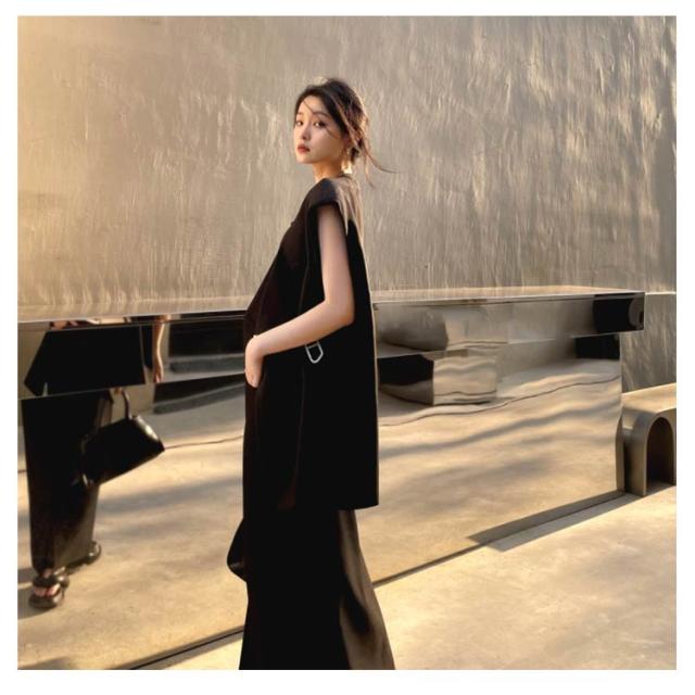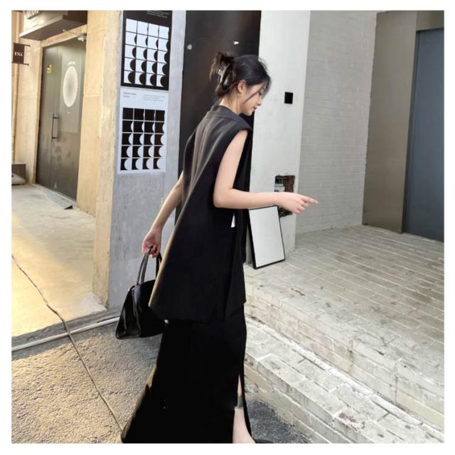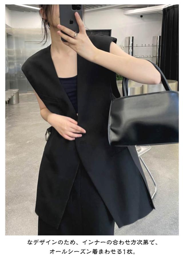 ロングベスト 春夏 チュニック丈 ロングジレ ベスト ノースリーブジャケット ノーカラーベスト ノースリーブ 前開き ジレジャケット レディース Vネック おしゃれ ジレ エレガント フォーマル カジュアル 通勤 ブラック