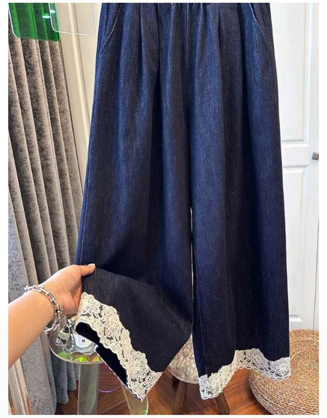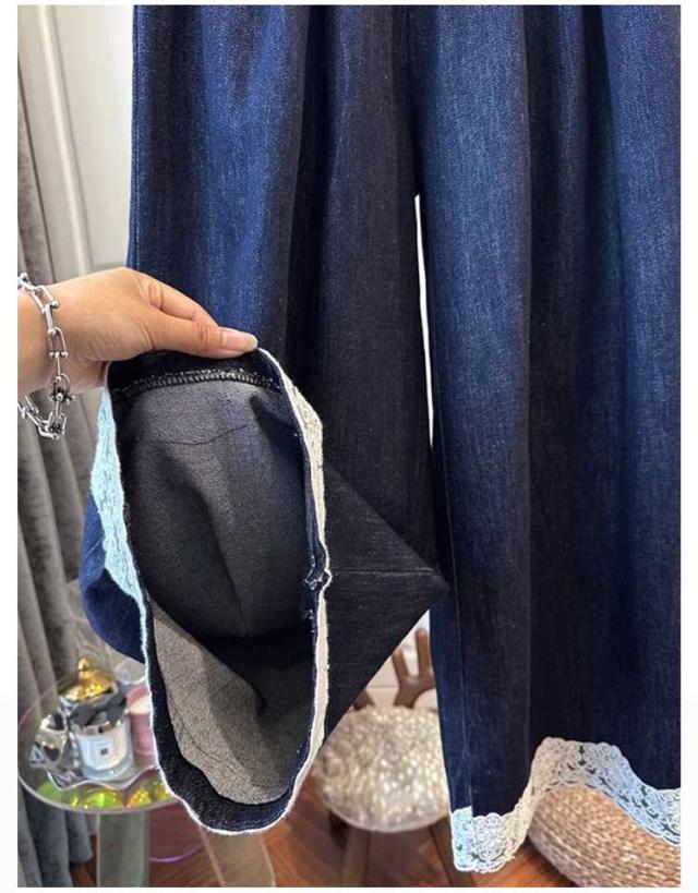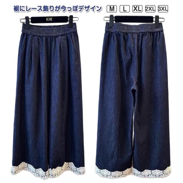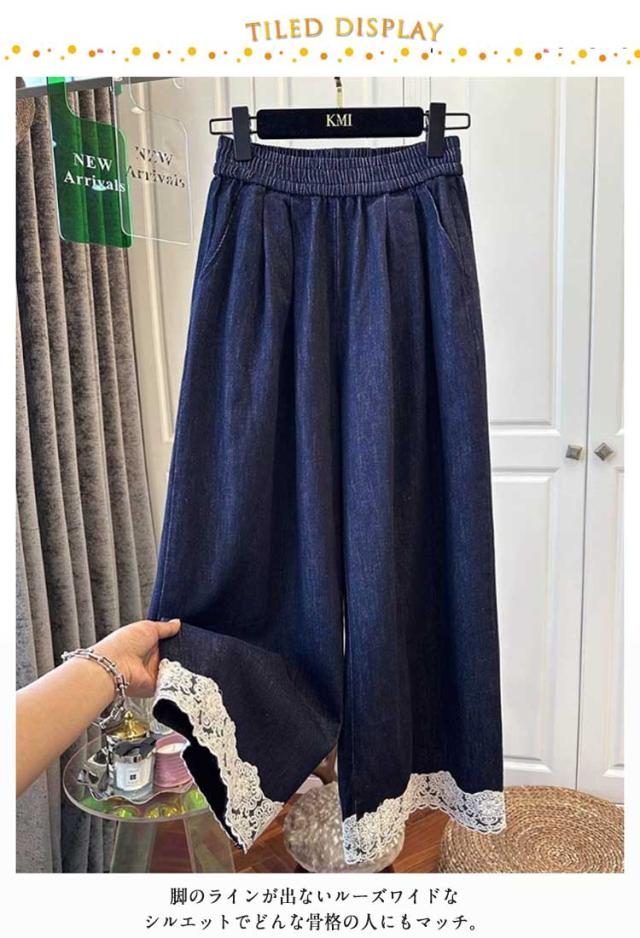 イージーパンツ カジュアル 大きいサイズ ワイドパンツ ウェストゴム デニムパンツ 裾レース ウェストゴム デニムパンツ おしゃれ きれいめ 春
