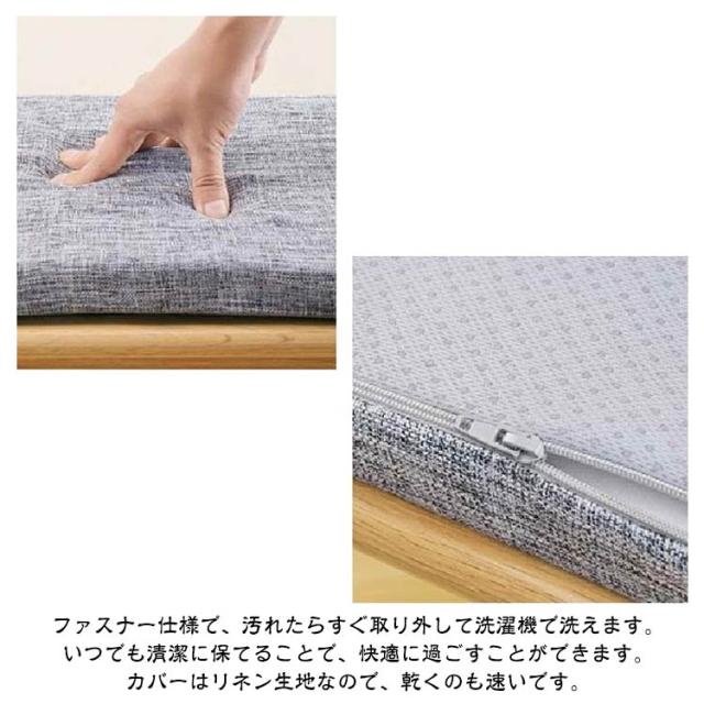 | リネン地のカバーが取り外し洗える可能なベンチシートクッション。【全11色】 カバーはリネン生地、風合いがあり、ナチュラルな素材です。落ち着いた色はどんな部屋でも馴染む、四季問わず使えられます。カラーは全11色、厚さは2cm、お部屋のインテリアに合わせてお選びいただけます。 中身は高密度のスポンジでできており、回復性がよく、座る時に、体圧を分散して身体を柔らかく支えることができるので、圧迫感を感じません。長時間の座り作業でも疲れません。デスクワークが多い方にぴったりです。 クッションの底にシリコンの滑り止め付きです。ベンチクッションの両端にシートベルトが付きます。立ったり座ったりした際のズレ落ち防止、お子様やお年寄りのいるご家庭でも安心してご使用いただけます。 ファスナー仕様で、汚れたらすぐ取り外して洗濯機で洗えます。いつでも清潔に保てることで、快適に過ごすことができます。カバーはリネン生地なので、乾くのも速いです。 | |