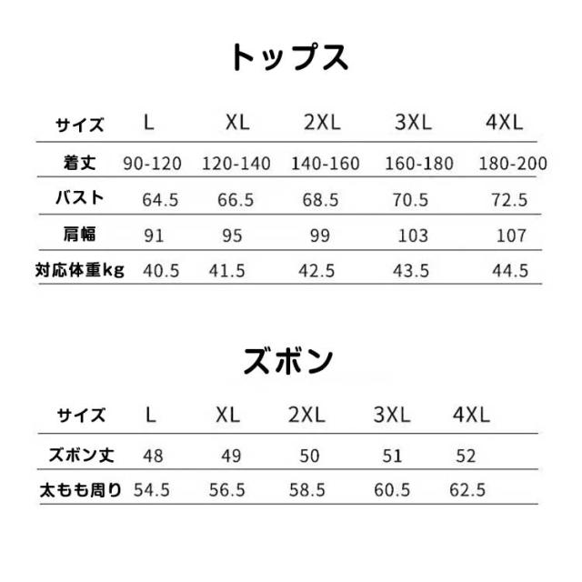| サイズについての説明 | L(45-60kg) XL(60-70kg) 2XL(70-80kg) 3XL(80-90kg) 4XL(90-100kg) ※写真通りです。※サイズ表の実寸法は商品によって1-3cm程度の誤差がある場合がございます。 |