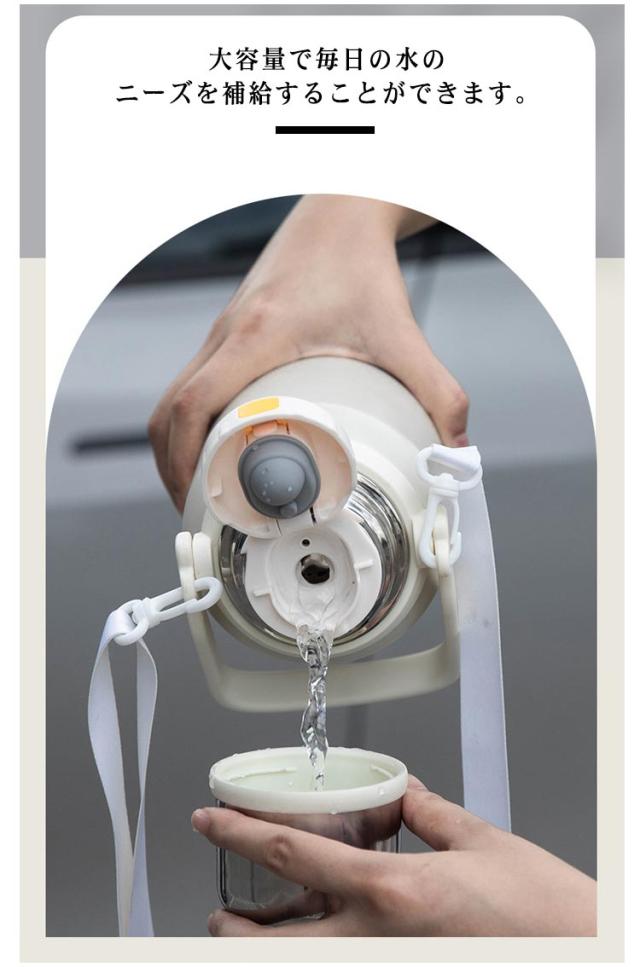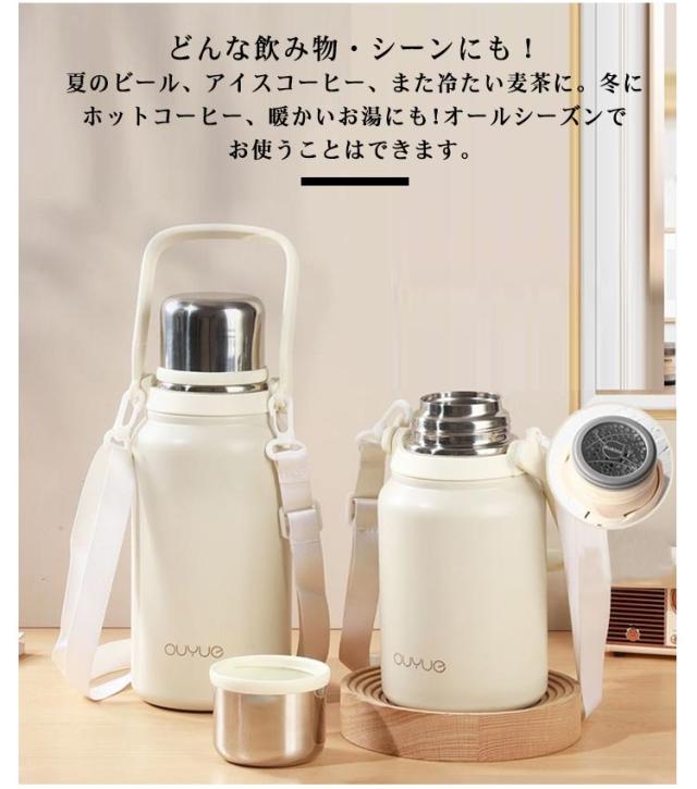 | 保温&保冷水筒/コップと肩紐付!茶こし付き ハンドル付き 水筒 タンブラー いろんなシーンで大活躍!ホーム、オフィス、アイスドリンク、バーベキュ、運動やアウトドアなど幅広いご使用いただけます。自分用だけでなく、プレゼントとしても人気が高い! 真空2重構造を採用しているので保冷、保温性は抜群! 大容量で毎日の水のニーズを補給することができます。 保冷・保温に優れたステンレスボトルです。温かい状態も冷たい状態も長時間キープすることができます。 どんな飲み物・シーンにも!夏のビール、アイスコーヒー、また冷たい麦茶に。冬にホットコーヒー、暖かいお湯にも!オールシーズンでお使うことはできます。 ベルトがついているため、持ち運びに楽々!どこでも簡単に移動できます。取り外せるショルダーストラップが付いているのでお子様用にも◎ | |