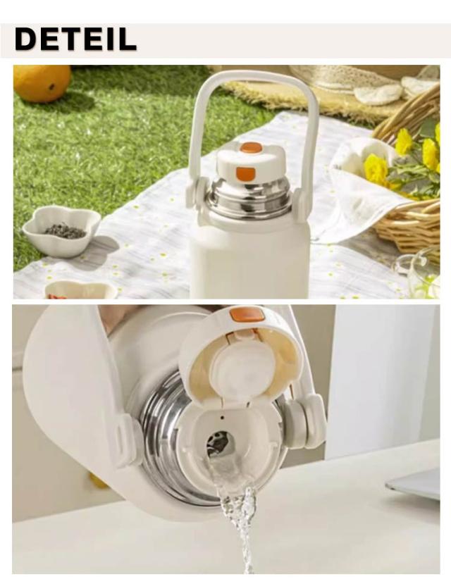 | 保温&保冷水筒/コップと肩紐付!茶こし付き ハンドル付き 水筒 タンブラー いろんなシーンで大活躍!ホーム、オフィス、アイスドリンク、バーベキュ、運動やアウトドアなど幅広いご使用いただけます。自分用だけでなく、プレゼントとしても人気が高い! 真空2重構造を採用しているので保冷、保温性は抜群! 大容量で毎日の水のニーズを補給することができます。 保冷・保温に優れたステンレスボトルです。温かい状態も冷たい状態も長時間キープすることができます。 どんな飲み物・シーンにも!夏のビール、アイスコーヒー、また冷たい麦茶に。冬にホットコーヒー、暖かいお湯にも!オールシーズンでお使うことはできます。 ベルトがついているため、持ち運びに楽々!どこでも簡単に移動できます。取り外せるショルダーストラップが付いているのでお子様用にも◎ | |