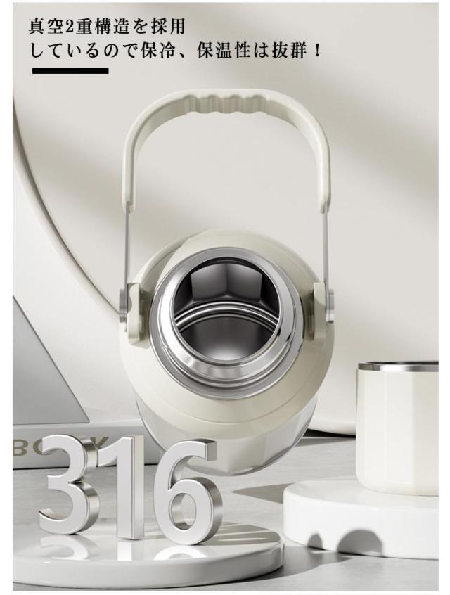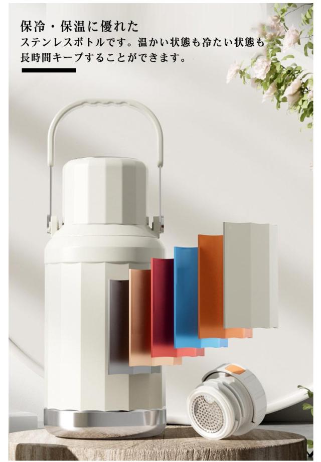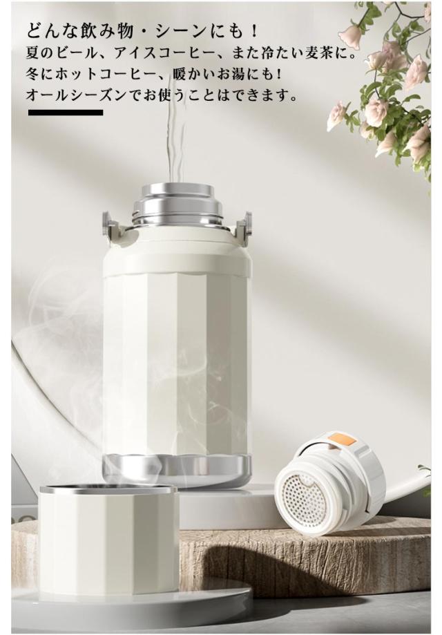 | 保温&保冷水筒/コップと肩紐付!茶こし付き ハンドル付き 水筒 タンブラー いろんなシーンで大活躍!ホーム、オフィス、アイスドリンク、バーベキュ、運動やアウトドアなど幅広いご使用いただけます。自分用だけでなく、プレゼントとしても人気が高い! 真空2重構造を採用しているので保冷、保温性は抜群! 大容量で毎日の水のニーズを補給することができます。 保冷・保温に優れたステンレスボトルです。温かい状態も冷たい状態も長時間キープすることができます。 どんな飲み物・シーンにも!夏のビール、アイスコーヒー、また冷たい麦茶に。冬にホットコーヒー、暖かいお湯にも!オールシーズンでお使うことはできます。 ベルトがついているため、持ち運びに楽々!どこでも簡単に移動できます。取り外せるショルダーストラップが付いているのでお子様用にも◎ | |