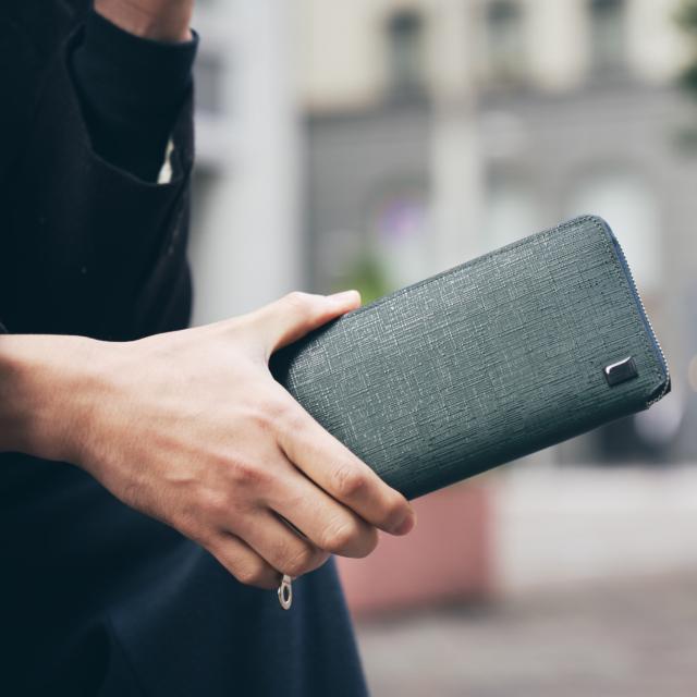 『 College ser. 』カレッジシリーズ印象的な細かい型押しが特徴のシリーズ立体感があり表面のツヤが特徴的な型押しのカウレザーを使用し、SOLATINAオリジナルのブローチがポイントになっております。表面にキズが付きにくく、中作りは、ラム革(羊革)を使用しているので非常に手触りよく、高級感を増しております。カード等の収納にも優れたラウンド型のウォレットになります。こちらは付属のパスケースも付いております。