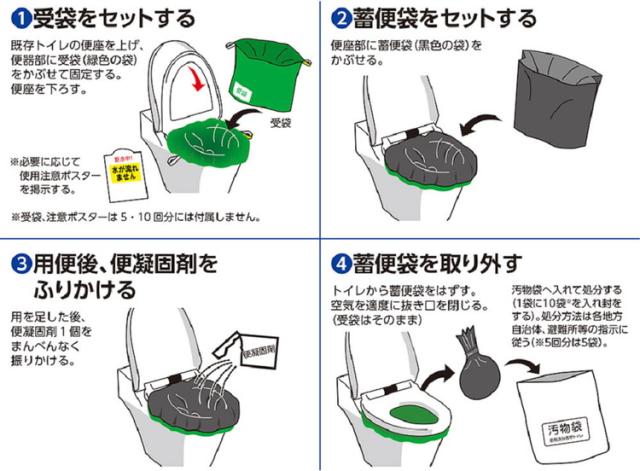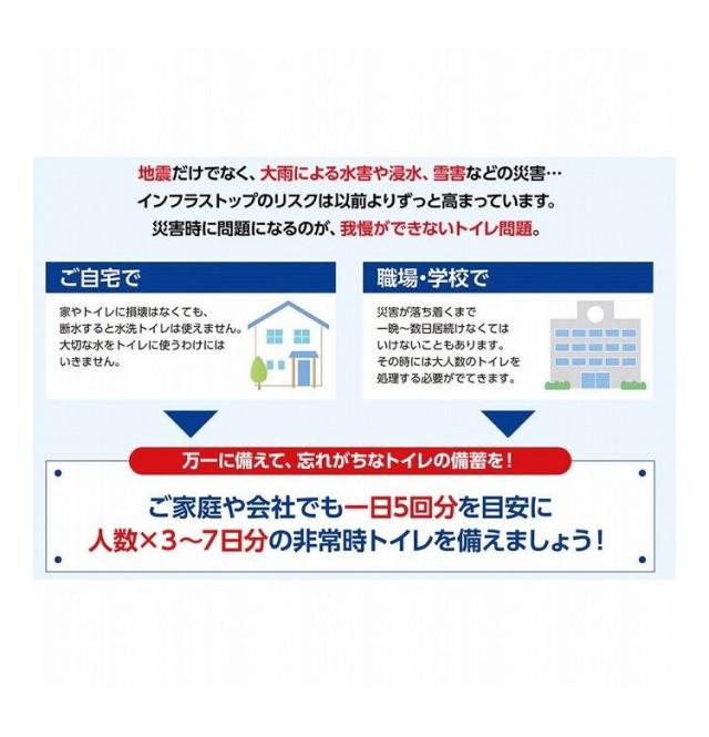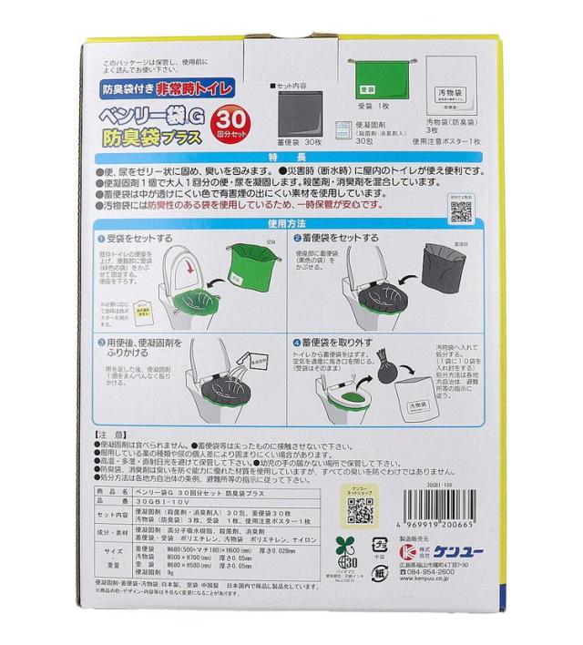 便凝固剤(殺菌剤・消臭剤入) 30包、便袋30枚、汚物袋 (防臭袋) 3枚、受袋1枚、使用注意ポスター1枚