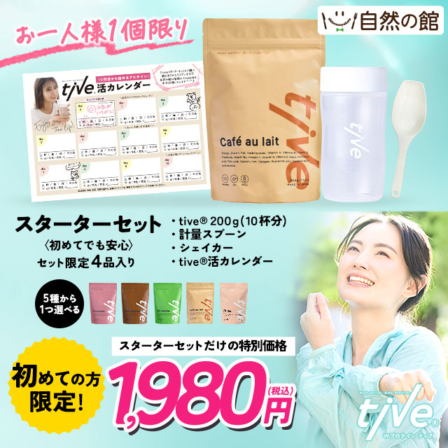 【毎月先着500セット】お一人様1個限り プロテインスターターセット(プロテイン10日分+計量スプーン+シェイカー+tive活カレンダー) 人工甘味料不使用 保存料無添加 200g
